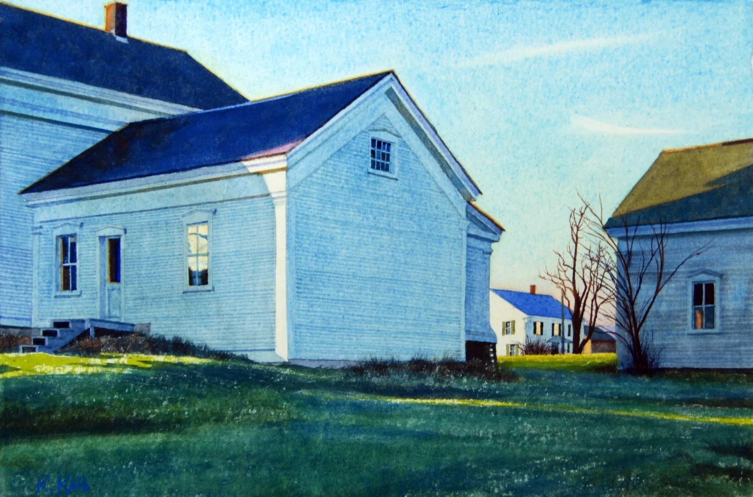 Kathleen Kolb is interested in the action and meaning of visual light on everyday surroundings and in the intersection of emotional experience with what we see. As a painter, her work is based in observation. The primary theme in all her work is light. In addition to light, her work is about attachment and place. She is drawn to rural landscape and to the formal qualities of the geometry of traditional New England architecture, looking for inspiration in rural landscape, wilderness, and small town New England. Her aim is to evoke a time and place in our shared world, and a corresponding emotional experience. Her method is to spend time paying acute attention. She searches out subjects that are visually arresting and that evoke riveting emotional energy.